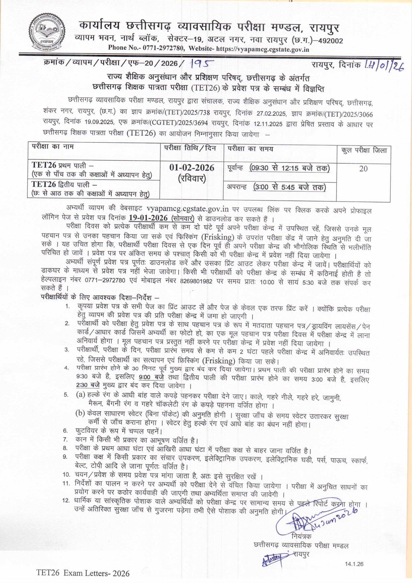 Chhattisgarh Professional Examination Board (CG Vyapam) will soon release the admit cards for the Chhattisgarh Teacher Eligibility Test (CGTET) 2026 on its official website. Candidates who have successfully applied for CGTET 2026 can download their admit cards online using their registration number and date of birth. The CGTET admit card is a mandatory document for appearing in the examination and contains important details such as the exam date, time, paper (Paper-1 or Paper-2), examination center address, and candidate information. Applicants are advised to download and print the admit card well in advance of the exam date to avoid last-minute problems. No candidate will be allowed to enter the examination center without a valid CGTET 2026 admit card.