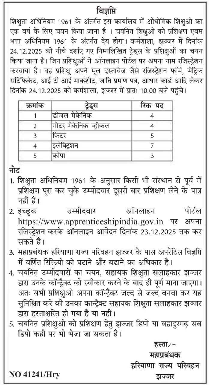 Jhajjar Roadways Apprentice Recruitment 2025 notification has been released for the engagement of ITI Apprentices in various trades. Eligible candidates who have passed ITI from a recognized institute can apply online through the official apprenticeship portal within the prescribed dates. This recruitment aims to provide practical training and skill development to candidates in technical trades under Haryana Roadways, Jhajjar Depot. Selection will be done as per apprenticeship rules, mainly based on merit. Interested applicants are advised to read the official notification carefully before applying to check eligibility, trade-wise vacancies, and important instructions.