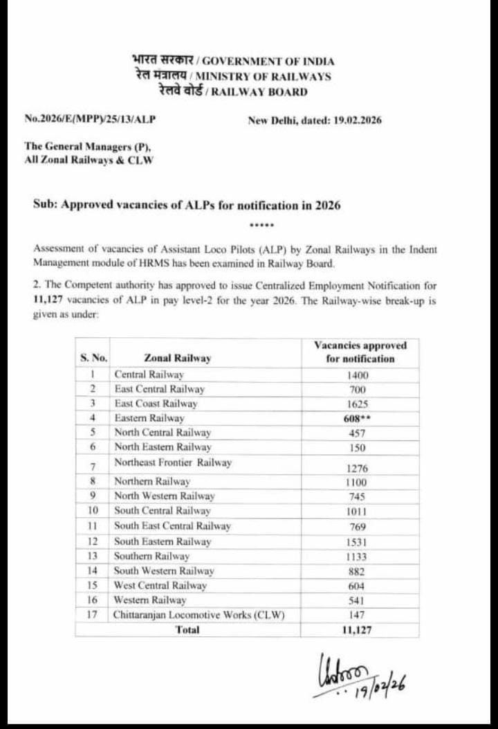 Railway Recruitment Board (RRB) is expected to release the official notification for RRB ALP Recruitment 2026 to fill 11,127(Tentative) Assistant Loco Pilot (ALP) vacancies across various railway zones. The vacancies have been approved by the Railway Board for the year 2026. This is a golden opportunity for candidates holding ITI / Diploma qualifications who are preparing for Railway jobs. Interested applicants will be able to apply online through the respective RRB regional websites once the notification is released. Candidates are advised to check eligibility criteria, age limit, selection process, and exam pattern before applying.